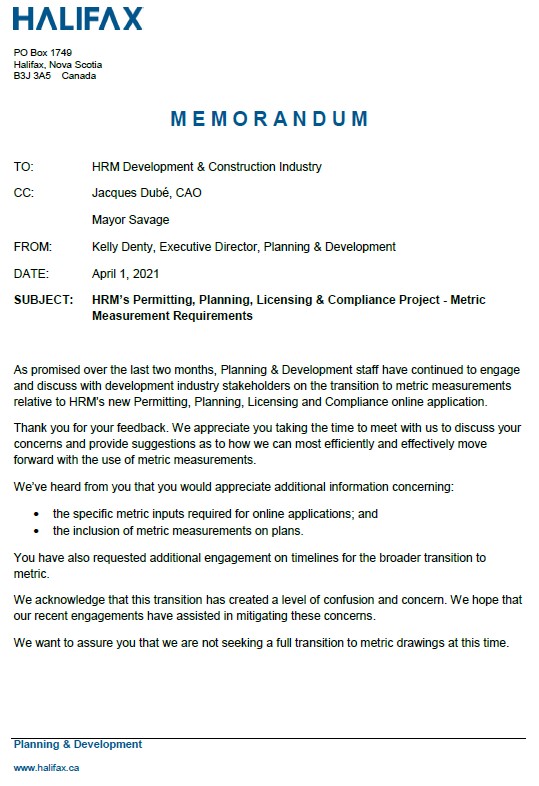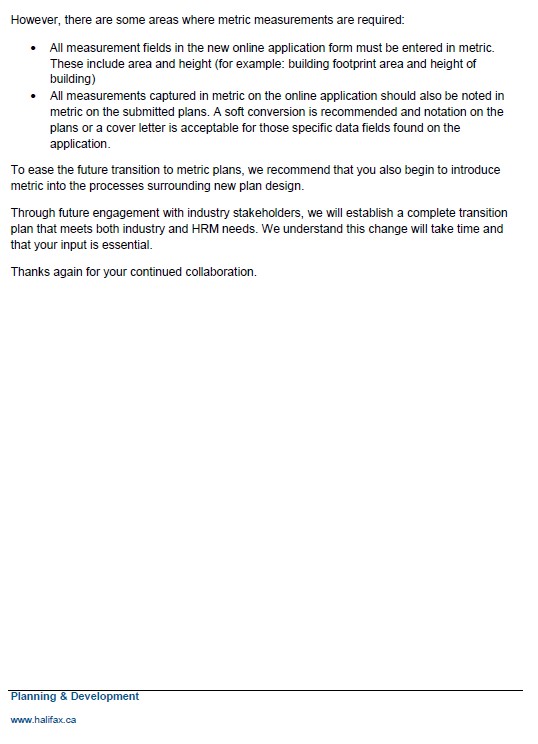 “Over the last few months, staff have continued to engage and discuss with development industry stakeholders on the transition to metric measurements relative to the new Permitting, Planning and Licensing and Compliance online application.”