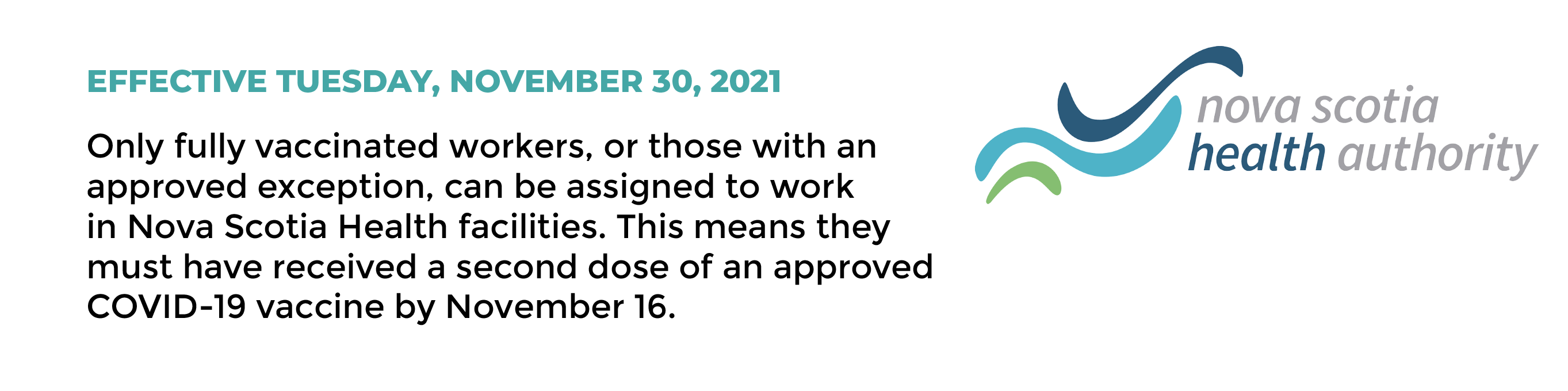Only fully vaccinated workers, or those with an approved exception, are assigned to Nova Scotia Health facilities as of November 30. This means they must have received a second dose of an approved COVID-19 vaccine by November 16.
