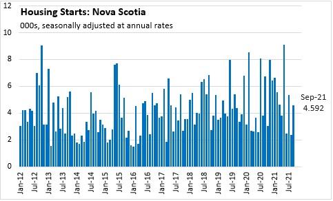 - Compared to September 2020, Nova Scotia’s housing starts were 31.8% lower with a 50.5% decline in Halifax and a 37.2% increase outside of Halifax.